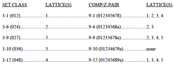 [11] These 28 “none” sets divide into two groups, shown here in Tables 3 and 4. The first group (Table 3) includes the 17 scs that have the IS-property, but cannot be generated by TC of any kind; they are “prime.”(9) The second group (Table 4) consists of the remaining “none” scs, which can be generated by TC, but are not fully factorable and thus do not appear on any of the lattices presented herein.(10)