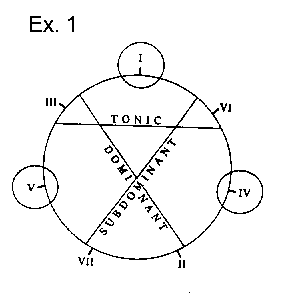 [3] Agmon's theory is admirable in its simplicity. Its principal components are (1) a definition, based on note-content, of degree of triadic similarity for diatonic triads; (2) the specification of three "principles" that "uniquely select the triads I, IV, and V as prototypes of three harmonic categories. . ." (201); and (3) two additional "principles" that "determine the additional members of each category and their respective prototypicalities." Of the five "principles," two that select prototypes and one that selects additional members are described as "self-evident," a status that might be granted one of the other two as well -- namely the principle that prototypes must not be maximally similar to each other.{4} The remaining principle, however, -- the principle of symmetry, which states that the graphic symmetry of Agmon's Fig. 2c, quoted here as example 1, "must not be violated" -- is not self-evident, nor is its necessity established by Agmon on any persuasive independent basis.