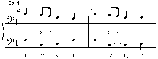 [8] We may perhaps agree with functional theory that "the so-called primary triads, I, IV, and V" are indeed primary in some meaningful sense. Example 4a is based on the succession of these primary harmonies prescribed by the most fundamental principle of their syntax: that of progression by fifth.{5} (Example 4b explains the origin of Schumann's II as the result of extending the bass of IV and letting the treble anticipate the fifth of the coming V.) The implication of the first falling fifth, f - b-flat, which could cast doubt on the identity of the tonic, is set right by the second one, c - f. Given the construction of the bass, people who hear musically will have a strong predilection to hear this final fifth as representing V - I even though its penultimate member does not bear the 5/3 sonority which alone would provide full congruence between scale-degree meaning and vertical chord. Add to this predilection the melodic factors described above and the penultimate chord c - e - a is heard as unmistakably expressing the "aura" of the dominant. It is a harmonic realization of the dominant scale degree. This means that the note a in no sense functions as a harmonic root here. The chord under discussion is not an inversion of an a-minor triad. Although it contains the notes of the triad of the mediant, if the Roman numeral as an analytic symbol is to reflect aural qualities of the music as heard by a perceptive listener rather than merely the appearance of the notation, the Roman numeral III cannot, without the accompanying "shudder-quotes" I have used here, accurately be applied to it.