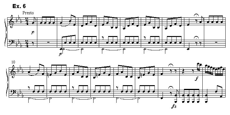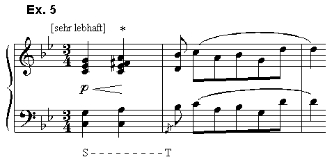 [14] Functional theory goes much further, though, because it insists that (for example) II always represents one of the primary categories -- usually S, less often D (see example 1). How plausible is this claim when it is applied to actual music -- for example, to the opening bars of Haydn's piano sonata Hob. 52, Finale (see example 6)?
