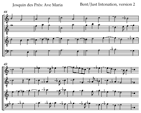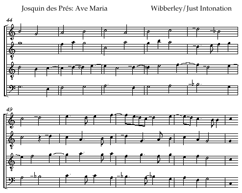 [I.6] Since I am not arguing for a rigid, purely theoretical system, but rather a pragmatic, flexible and ad hoc resolution--in practice-- of the conflicts between 3-limit and 5-limit intervals (this is what I am presenting as JI), I shall deal now with the possibilities offered by specific examples. The passage I wish to examine is the sequence from Josquin's Ave Maria which has been discussed elsewhere, for different theoretical purposes, by Margaret Bent and Roger Wibberley.