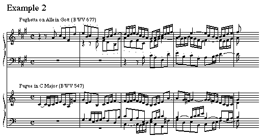 Example 2, Fughetta on Allein Gott (BWV 677) and Prelude in C (BWV 547), openings compared