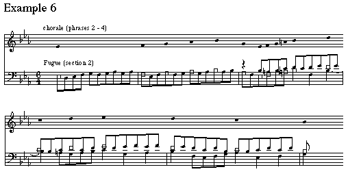 [22] The opening of the fugue's second section (measure 37) presents what initially appears to be a new subject: but closer examination reveals that it is nothing other than an elaborate variant of the original countersubject (see Example 5, measures 3-4, relating with the chorale's second phrase). So far, therefore, it can be seen (even supposing this to have been purely subconscious on Bach's part) that the fugue employs, in its first section, material closely related with the first two phrases of the chorale. If, however, one were to discover, as the fugue progresses, further references to the chorale melody articulated in a definite and schematic manner, this would begin to suggest that the composer was not operating only on a subconscious level but consciously deriving essential structural features from the chorale. Example 6 shows the opening of section 2, and the accompanying line supplied from the chorale's second, third and fourth phrases: