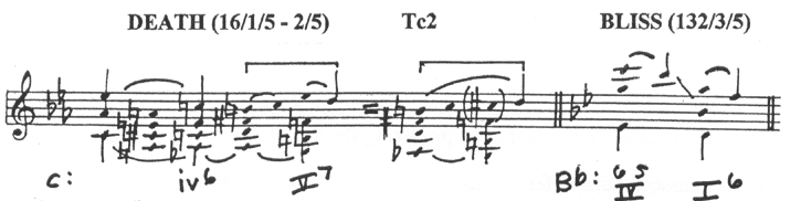 | b. | The DEATH motif, associated with Isolde's desire for revenge in Act I. Strongly associative, it nearly always concludes with a half close in C minor. BLISS, at the first embrace of the lovers in Act II, but already anticipated in its Prelude. |
