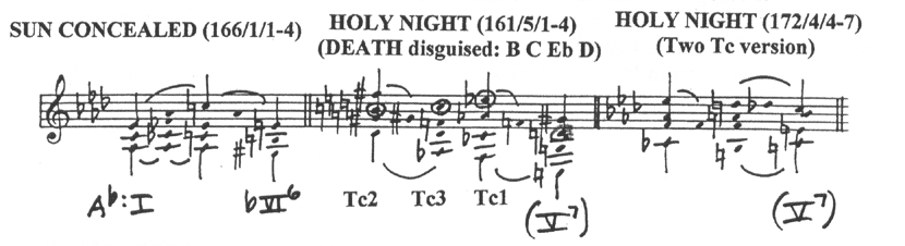 | d. | SUN CONCEALED motif (166/1/1-4). Two versions of HOLY NIGHT motif; the first rearranges the three original “Tristan chords” while second uses only two Tc’s. |