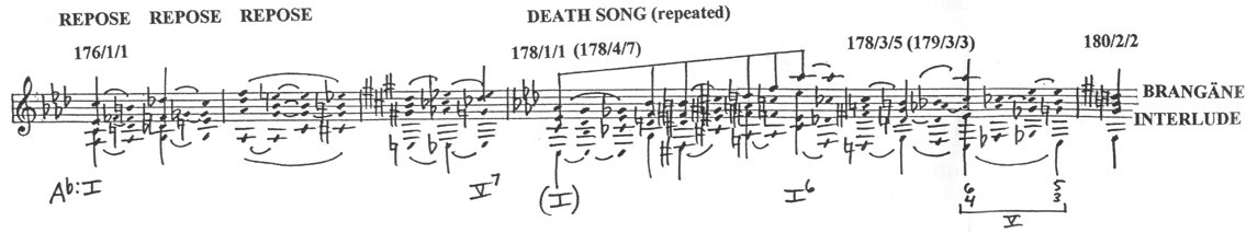 Example 9. Motivic and tonal summary of the Love Duet complex in Act II, Scene 2 of Tristan und Isolde, which will furnish the basis for the subsequent “recollection of memories” sections during the following scene and in Act III. The key of