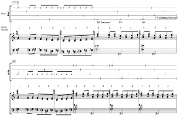 There are minor differences in how the two models are presented and naturally the observations and conclusions regarding Stravinsky’s music differ from those of Bartok and Schoenberg. Roeder links rhythmic process with the music’s formal design, paying particular attention to how pulse streams interact within sections, how they articulate boundaries, and how they create continuity. The cues from which accents are drawn may or may not be motivically generated. The present work focuses on passages in which all voices act in concert to project shifting metric patterns. In this ‘single-voice’ texture only one phase is projected at any point and the phase shifts are allied with the action of a determinate motive. This work also explores the aesthetic rather than the formal implications of the model. It should be noted that an instance of a phase shift similar to that described here is given in Example 1 of Roeder’s “Rhythmic Process and Form in Bartok’s Syncopation.”