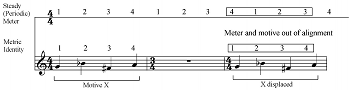 [4.2] Depicting the meters side by side does not suggest the simultaneous projection of all phases. If this were the case, every metric identity would sound at once, rendering the model useless for analytic purposes. Neither is it supposed that these meters have any existence independent of the music. Rather, they illustrate the potential phases of a meter within a given context. The phases are projected in accordance with motivic displacement and can be traced as follows: One of the meters is established at the outset by a determinant motive and to this motive we assign the metric identities 1, 2, 3, or 4, corresponding to the beats it projects. The established meter remains in force until such time that the motive is displaced so that its metric identity and the meter’s 1-2-3-4 count no longer align. Despite the contradiction, metric identity is retained, forging a shift in projection from the established meter to an out-of-phase meter of the same time signature. The motive’s metric identity serves to indicate which phase of meter is set in motion. This newly established meter remains in force until it too is contradicted, at which point it serves as a point of departure for the shift in projection, either back to the initial meter, or to another of the four phases. An irregularity then is the juncture at which the music shifts projection from one phase to another, and as interpreted in this model, is rightly regarded as a phase shift. If the irregularities caused by the displacement of motive X are interpreted as phase shifts, two of the four potential meters are drawn upon. These meters appear above the staff in Example 5 and their projection is indicated in cue-size notation. That the motive departs from and returns to the meter established at the outset can be visually apprehended in the model; the first and third statements project the same phase of meter.