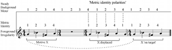 [2.2] The problem with extension is that it is not, strictly speaking, metric. Adding or deleting beats from an otherwise steady meter compromises periodicity, an intrinsic quality of meter. This cut and paste process is more suitably applied to pitch phenomena, phrases, chords, melodies, and the like, whose extension may trigger an irregularity, but it does not follow that meter has been extended in the same way. What is altered, however, is the pattern of metric identity. Confusion arises when theorists, assuming a single meter is in force, read this pattern as the entire meter. The result is a perception of meter as a single, albeit varying course of projection. It can be tempting to view beats as extended or contracted, as long as we acknowledge that they are a surface projection of meter, an effect, rather than the source. Whether dealing with background hypermetric irregularities of tonal music or the more immediate foreground irregularities of twentieth-century music, extension is of little consequence in reconciling periodicity with irregularity.