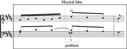 [14] Simply put, Schoenberg suggested that a musical idea, by nature, embodies some sort of conflict. Such an idea, which Schoenberg regarded generally as a unified combination of tones, durations, and harmonies, and sometimes also referred to as a Grundgestalt, or basic shape, expresses a musical “problem” that demands a contextually-satisfactory “solution.”(15) For Schoenberg, a musical idea is a brief, yet distinctive entity, often a component of a theme. Its problem, in turn, represents a truly “motivic” force, one that would seem to stimulate a corresponding response within the unfolding music. The solution of the problem forms the basis for the purely musical drama we perceive within the context of a composition.