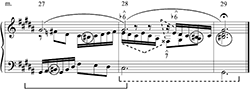 [8] Other pitch events provide further reinforcement of the semitonal pairing. For instance, the suspension figure on the downbeat of m. 10, involving the superimposition of