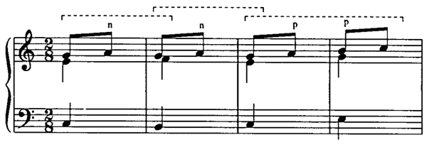 Neighbor-note motion, bars 1–2 (1994, p. 218)