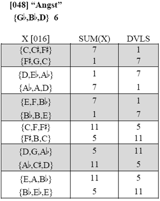 Figure 2. The [016] presets that cannot be isographically related—strong, positive, negative, and axial—to {G,B,D}, the “Angst” sonority