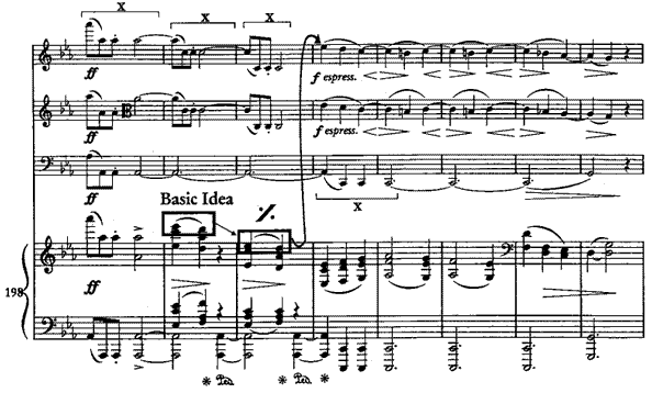 Example 1. Recapitulation of the main theme in op. 60/i (Smith's Example 3.6, showing motive X bridging between retransition and recapitulation)