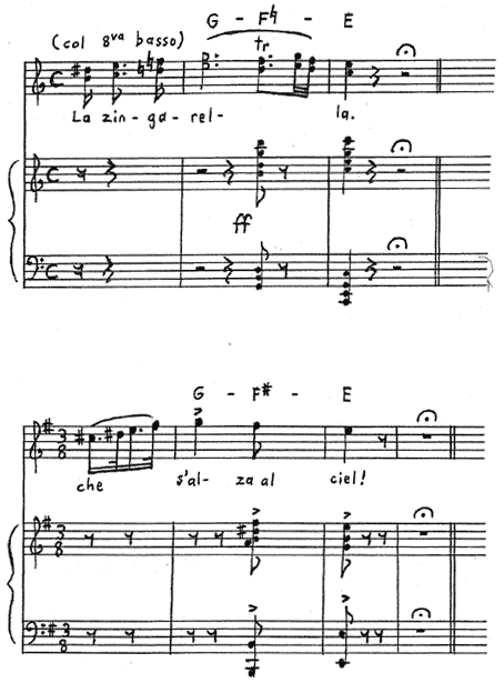 Example 11. Verdi, Il trovatore, Act 2, “Coro di Zingari e canzone,” end of chorus and end of canzone compared