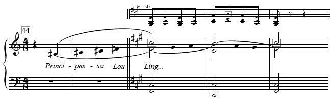 Example 10. Turandot, Act II, Fig. 44: The beginning of the principal section of ‘In questa reggia’