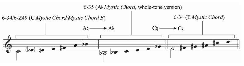 Scriabin, Poème, Op. 69, No. 1, mm. 1–5, acoustic/whole-tone interaction