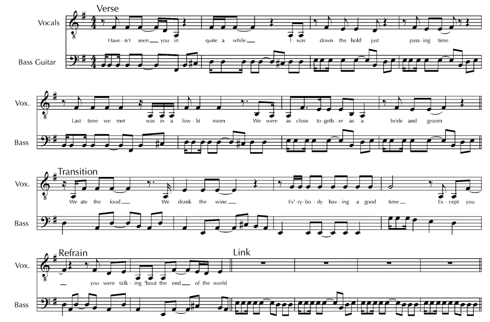 Example 3. Vocals and bass line of the Verse, Transition, and Refrain in “Until The End Of The World”