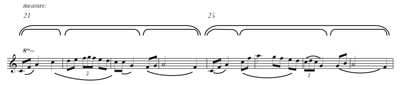 [21] As an entree into the relationship between the apparent grouping structure of a notated phrase and its hierarchical temporal segmentation in performance, Example 12