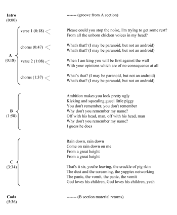 Example 1a. Radiohead‘s “Paranoid Android,” OK Computer (1997), lyrics and form