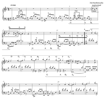 Example 6a. Mehldau, transcription of “Paranoid Android,” measures 1–24: Motivic repetitions in the intro and A section