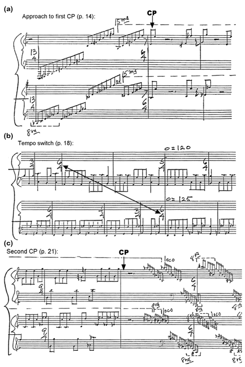 Figure 27. Score sections from Study No. 43: (a) approach to first CP; (b) tempo switch; (c) final CP
