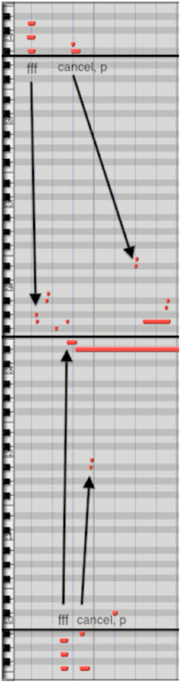 Figure 15. Independent volume control of treble and bass zones seen in one of Trimpin’s unedited MIDI files (with horizontal lines added to show the zones)