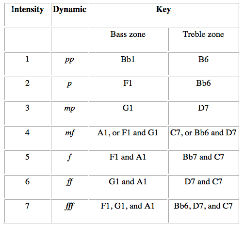 Table 1. Dynamic levels are controlled by punching single or combinations of holes in the margins of the rolls