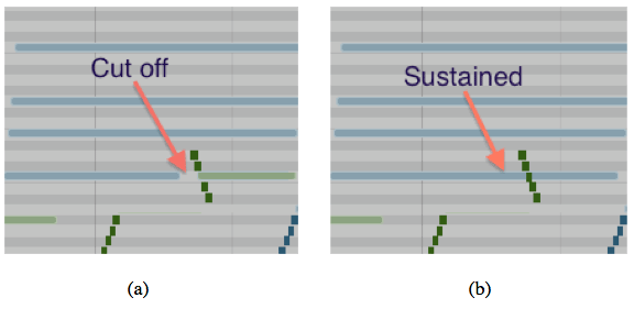 Figure 5. (a) Original, before editing, with the interruption of a sustained note. (b) After editing, the note is held out on the “blue” MIDI channel and the same pitch played on the “green” channel as part of the run.