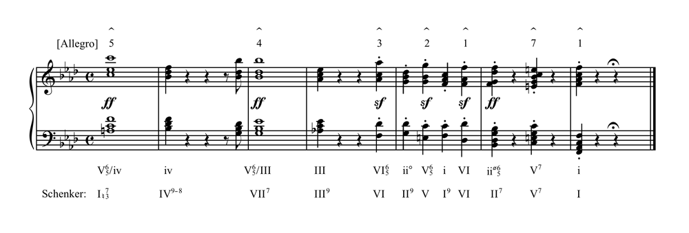 Example 1. Beethoven, Piano Sonata in F minor, op. 2, no. 1, first movement, codaSchenker’s Roman numerals appear below my own analysis