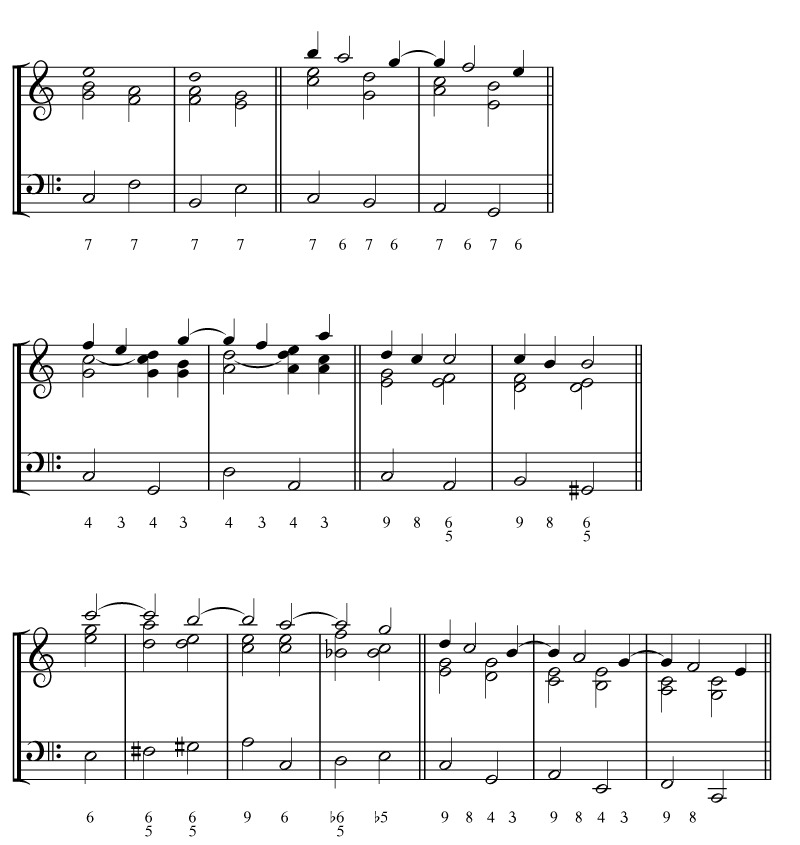 Example 5. C. P. E. Bach, Versuch (1753–63): thoroughbass patterns for the construction of a Bassthema with a “singing upper part” (author’s realization)