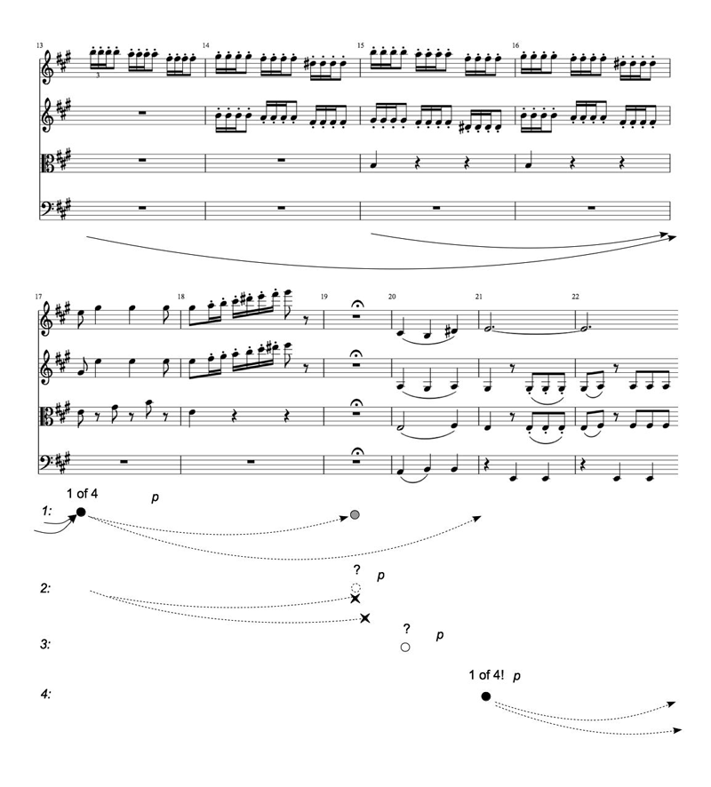 Example 7. A general pause defers the hypermetrical cycle (Dittersdorf, String Quartet no. 6 in A major, 2nd mvt., mm. 13–22)