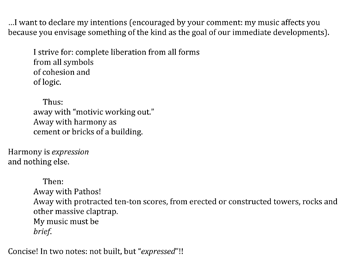 Example 1. Part of a letter from Arnold Schoenberg to Ferruccio Busoni, dated August 13, 1909 (translated by Antony Beaumont; a larger excerpt may be found in Beaumont 1987, 389)