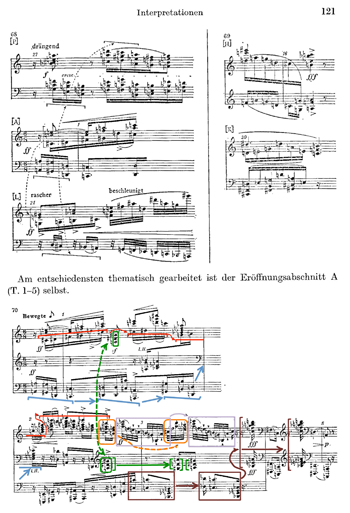 [17] The bottom half of Example 3 shows, in detail, a richly varied motivic network within the opening 5 measures of section A itself. Within this passage, a number of strands exhibit incremental development away from the original motive, exemplifying developing variation. The bass line presents a succession of varied forms of its initial three-sixteenth, dotted-eighth motive, highlighted in blue: <-1, -6, -2>, <0, +11, -16>, <+3, -9, +1> (the colors are my addition to Brinkmann’s original example, but the boxes, brackets and arrows are his). Likewise, the alto voice’s opening six sixteenths (highlighted in red) give rise to a motivic succession: they first undergo a liquidation to four sixteenths, then repeat on different pitches, and then extend and augment themselves to three sixteenths and three eighths, with contours and some ordered pitch intervals kept intact. Three repetitions of what is commonly called the “Viennese Trichord,” a vertical combination of unordered pitch intervals 5 and 6 (with the tritone below the perfect fourth), forming set class 3-5 (016), are circled and bracketed, as is its close transformation consisting of pitch intervals 6 and 7, with the tritone below the perfect fifth (highlighted in green). Other melodic and chordal motive successions are circled as well, highlighted in orange, purple and brown. The brown succession progressing from the last sixteenth of m. 2 to m. 5 could perhaps be reconceived; its two boxed elements at the beginning are identical in pitch, though spelled enharmonically, but the large bracketed chords starting with the final chord of m. 3 seem to me to fit better on the “Green Line” of Viennese Trichord transformations, since the left hand of both chords either consists of or contains <