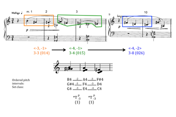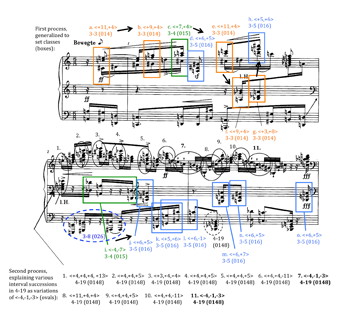 Example 6. The second motivic process from op. 11, no. 1, explaining other interval successions in set-class 4–19 in terms of an overlap of the first two stages in Example 4. Used by permission of Belmont Music Publishers, Los Angeles