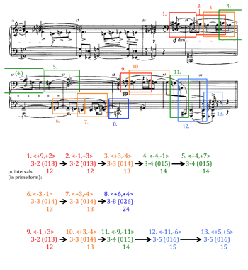 [36] Measure 7, at the top left corner of the example, presents three interval successions in the same rhythm of two bound sixteenths, all belonging to set-class 3-4 (015), followed by the expansion 3-8 (026) at the fermata. As for mm. 10–11a, an interval succession belonging to 3-4 in the left hand and a 3-3 chord in the right give way to a whole series of 3-5 chords in both hands, while in the right hand at the end of the passage, 4-19 (0148) progresses to 4-24 (0248), expanding the first pitch-class interval in 0148 while contracting the second. In m. 14, the right hand begins by expanding from 3-3 to 3-5 (a path it has taken in several of the previous examples), and then goes from a 3-4 chord to a 3-5 melodic segment at the end of the measure. Meanwhile, the left hand in the second half of m. 14 reaches the furthest extent of ordered pitch-class interval expansion we have heard to this point: it begins at 3-8 (026) and expands the second ordered pitch-class interval of that prime form from 4 to 5 to attain 3-9 (027).