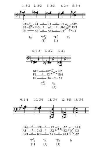 [28] A question could be brought up at this point as to whether it is possible to hear the successions of ordered pc intervals in prime forms I have just described as “expansions” in any meaningful sense. For example, in one case (sets 3 and 4), one of the pitch intervals that represent set class 3-3 (014) moving to 3-4 (015) grows smaller, in another (sets 10 and 11), the pitch intervals representing 3-3 and 3-4 grow larger, but not incrementally. The answer I would give to this question is that even though the ordered pitch intervals of sets such as these do not expand incrementally, there are indeed audible differences between the set-classes 3-2, 3-3, 3-4, 3-5, and 3-8, which depend on the understanding of their intervals as relatively small or large in pitch-class space. Many of us have participated in post-tonal aural skills exercises in which our instructor asked us to distinguish between the various trichordal set-classes, suggesting that we reduce what we hear to a normal form by transposing and reordering the pitches, and then considering whether the intervals between the resulting notes are half steps, whole steps, minor or major thirds, perfect fourths, etc. After a while, without doing the mental work of transposing and reordering, we begin to hear 3-2 in any voicing as more “compressed” than 3-3 or 3-8, because of the characteristic interval-class 1 dissonance of one of the trichord’s intervals, be it half-step, major seventh, or minor ninth, and the interval-class 2 dissonance of one of the others. My assertion is that the set-class expansions I describe in this article can be heard in much the same way: as progressions from chords more dependent on smaller interval classes (such as seconds and sevenths) to those featuring larger interval classes (thirds, sixths, fourths and fifths, and tritones).(8)