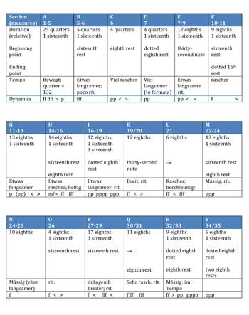 Example 8. Reinhold Brinkmann’s form chart for op. 11, no. 3, translated from pp. 110–11 of Arnold Schönberg: Drei Klavierstücke op. 11: Studien zur Frühen Atonalität bei Schönberg (1969)