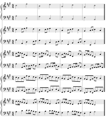 [2.6] PlayIt assignments adhere strictly to four design parameters. First, to ensure that students spend their practice time exercising their ears and brains, and not solely their fingers, the pianistic difficulty of an activity for a non-pianist must not exceed the aural, conceptual, and/or creative challenge. In spite of the value of realizing long figured basses or harmonizing whole chorales in four voices, assigning these tasks to non-pianists comes with a substantial cost: they require so much practice time as to exclude other valuable activities and, as I have experienced, their difficulty often motivates students to cope by writing out their solutions and reading them. Second, to accommodate the variety of pianistic facility among my students, I offer, when possible, three levels of challenge for each activity: a standard option for students with typical (i.e., modest) comfort at the keyboard, a more challenging version for stronger pianists (e.g., playing in more remote keys or in four rather than two voices), and a not-too-watered-down modification that reduces the technical challenge for students with very limited facility without sacrificing its pedagogical value. For example, a student might record at a slower tempo or play just one voice out of a two-voice texture while SM plays the other one.