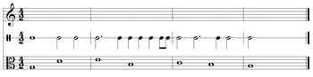 [3.8] Fill-in-the-Blanks. Many activities provided a notated prompt in the software and instructed students to fill in what was missing. The head start was either an incipit that students continued, one outer voice to which they added the other one or the rest of a four-part texture, or a series of scattered hints that they connected to create a complete passage. Students could guide their practice by playing along with SM’s aural realization of the head start, but I asked them to turn off the SM audio when they recorded. Example 6 shows a sing-and-play activity that students completed while they were learning second-species counterpoint. The head start in Example 6 appeared on screen; students composed the missing parts of the cantus firmus and eventually performed both parts, playing one while singing the other, as heard in Example 6 (Audio), which was submitted by an oboist. (For other assignments of this type, they played both parts.) This activity type is very similar to activities that I used to assign on paper, except that the PlayIt format forces students to hear and play their ideas, both during the process of composing and at the stage of submitting a final product.
