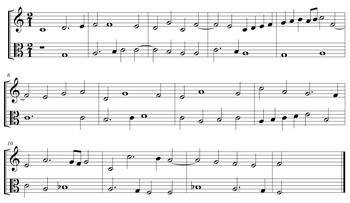 [5.1] The examples in this section are drawn from all three of the counterpoint courses that I teach at MSU. There are two levels of tonal counterpoint; the first builds toward composition of basic minuets, two-part inventions, and chorale settings, while the second deals with more advanced techniques such as chorale prelude, solo polyphony, and fugue. The third course, on modal counterpoint, roughly follows the ordering of Peter Schubert’s (2008) textbook, beginning with strict species and proceeding through free two-part writing to three-part writing, culminating in three-voice invertible canons.