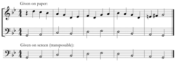 [3.9] Transposition. As soon as the first-year students mastered key signatures and scale degrees early in the semester, their PlayIt assignments began to include transposition. The earliest tasks focused exclusively on transposition in order to build the skill on its own prior to its inclusion in almost every subsequent assignment. These transposition-only assignments require careful design, since SM itself transposes the given score and audio with no effort on the student’s part; my solution was to provide some notation in the software, which SM transposes with one click, and the rest of the notation only on the PDF assignment sheet, which students had to transpose on their own. Example 7 shows an early example. Here, both a cantus firmus and a second-species counterpoint appeared on paper for students, but only the cantus firmus (i.e., lower staff) appeared on the screen in SM. The assignment was to transpose the entire duet to other keys and play both parts simultaneously. The task was digitally scaffolded: the easily transposable, on-screen cantus firmus served as a reference against which to double-check the accuracy of the counterpoint line that students transposed functionally on their own. An advantage of activities such as this is that they reinforced two discrete skills within the same activity: explicitly, functional transposition using scale degrees; and, more implicitly, the principles of second-species counterpoint, which also was a concurrent focus of the first-year course.