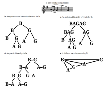 [2.1.3] The non-representational “inclusional hierarchy of events” in Example 2c is the same tree as the representational hierarchy; only the labeling of nodes is different. This difference is not insignificant: in the representational hierarchy an additional choice is made at each level of structure as to which note is more “representative” of the pair, a choice that is not made in the inclusional hierarchy. Also, the inclusional hierarchy misses an important characteristic of most structural theories of tonality, the possibility of parallelism between levels (here, the parallelism of the two passing motions). Nevertheless, the difference is not foundational; it would be more accurate to say that the “representationalism” is an added feature over the basic form of a binary hierarchy of score-objects.