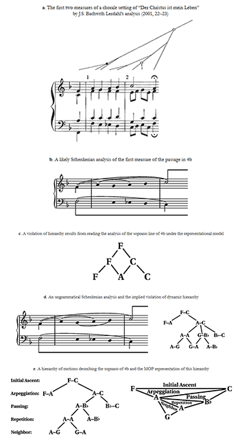 12. Larson (1997, 119–120) makes a similar point about Lerdahl’s model, and Lerdahl’s response (1997, 141–3) concedes that the model is unintuitive in certain situations (as with simple passing notes) but defends it on the grounds of simplicity and consistency. Lerdahl and Jackendoff (1983, 114–116) similarly associate dynamic hierarchy with a “network notation” that they call “impracticable.” This claim assumes that the alternative to the binary trees of events is something along the lines of the “directed acyclic graphs” described in Kirlin and Utgoff (2008). Marsden (2010) similarly dismisses directed acyclic graphs as adding a layer of computational complexity over binary trees. Dynamic hierarchy as modeled by MOPs, however, is actually considerably simpler than representational hierarchy (as shown by the combinatorial considerations in the previous note).