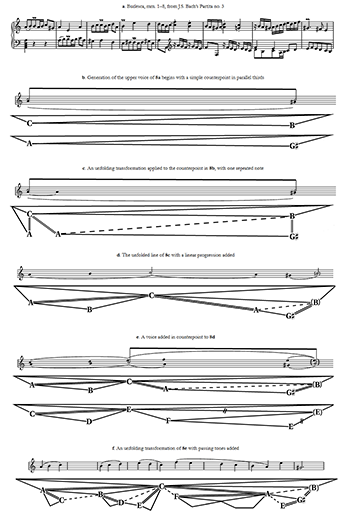 [3.1.2] The idea Schenker hit upon in his analysis of Bach’s modest Little Preludes that led to the concept of Ursatz and the theory of Free Composition was what he calls Stimmführungsprolongationen (voice-leading prolongations) in those essays. This technique involves a vertical arrangement of musical lines and counterpoints beginning with a simple counterpoint on top and gradually deriving more musical content proceeding downward, until arriving at something recognizably close to the musical surface of the piece. While the analyses of Little Preludes nos. 3 and 5 (Schenker [1921–3] 2004, 175–6, 180–1) are the first applications of this technique to entire pieces, more limited instances appear in earlier essays.(18) The method is used specifically to reveal underlying contrapuntal structures, and is connected with the theory of prolongation developed in the second volume of Counterpoint (1987).(19) Schenker’s earlier focus on Fuxian teaching and contrapuntal rules in the Counterpoint volumes did not yield a punchy argument against a theory of chord successions. The Stimmführungsprolongationen achieved this by invoking counterpoint in a more abstract sense, allowing Schenker to assert the primacy of linear organization by reconceptualizing contrapuntal voices as contingent upon hierarchical level. From this point onward, these types of graphs became a staple of his analytic technique (see Yust 2006, 10–19, 31–39).