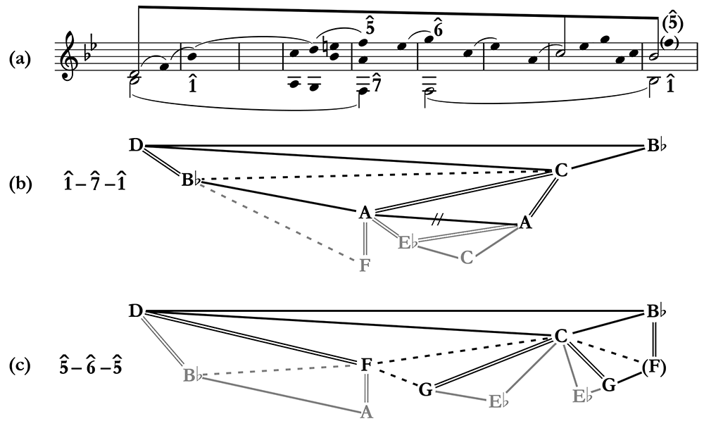 Example 12. A reduction of the Menuetto with two possible choices of structural inner voice (a), and some structural consequences of each choice (b–c)