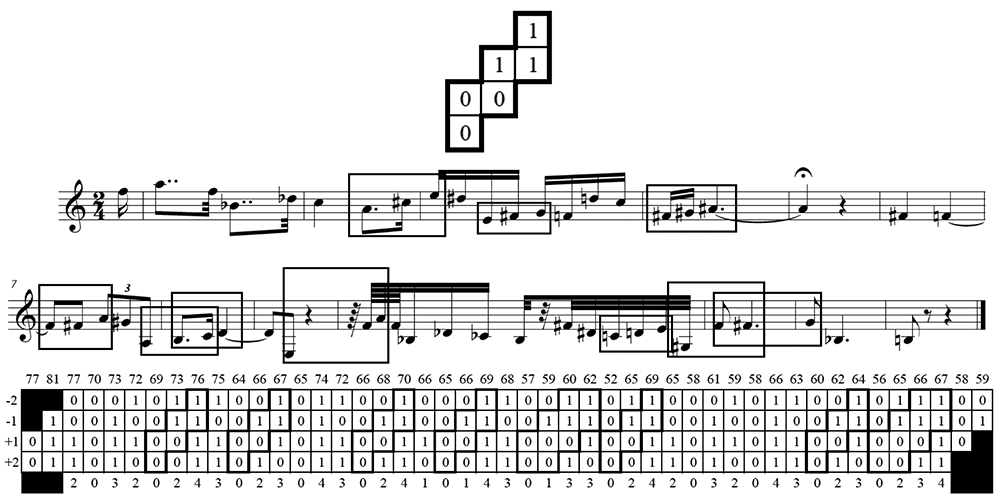 Score and CONTCOM with the most common melodic triad (CSEG <012>) boxed