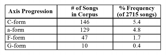 Example 2a. Overall Frequencies of Songs with the C-form, a-form, F-form, or G-form of Axis Progressions in the Billboard Year-End Hot 100 Corpus, 1990–2016