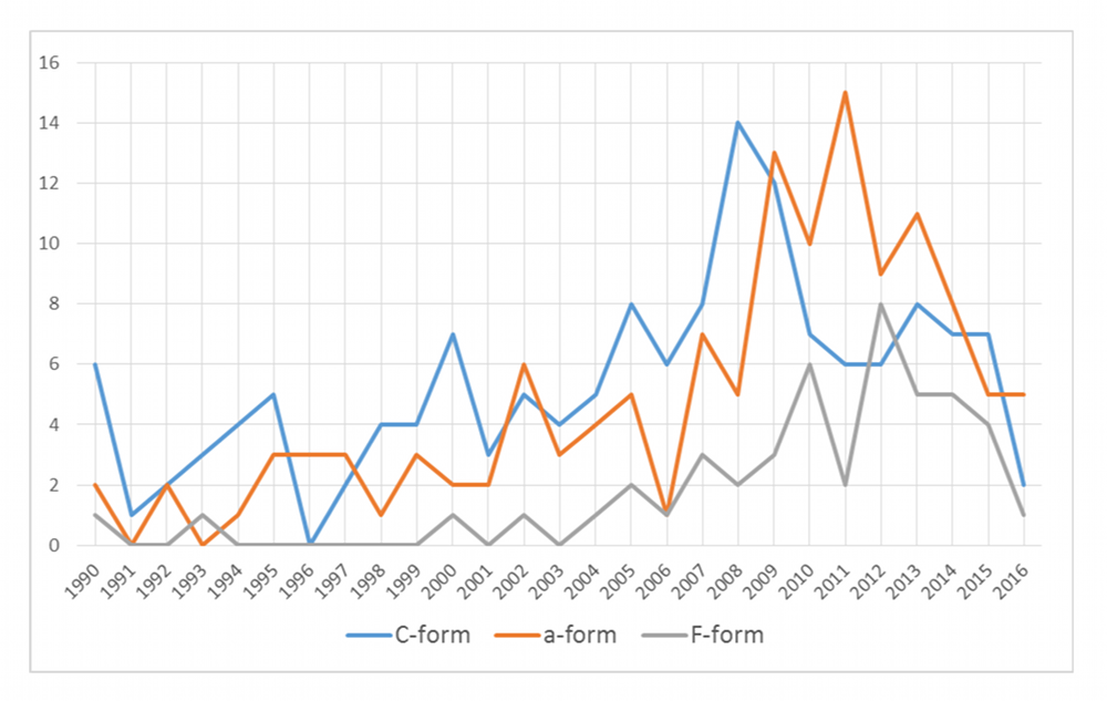 Example 2b. Annual Frequencies of Songs with the C-form, a-form, and F-form of Axis Progressions in the Billboard Year-End Hot 100 Corpus, 1990–2016