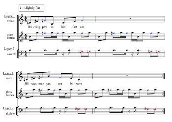 [1.4] The transcription in Example 1 illustrates how the pitch content of the accompaniment of “Jumping Jack” is separated into two layers: the glass bottles contain